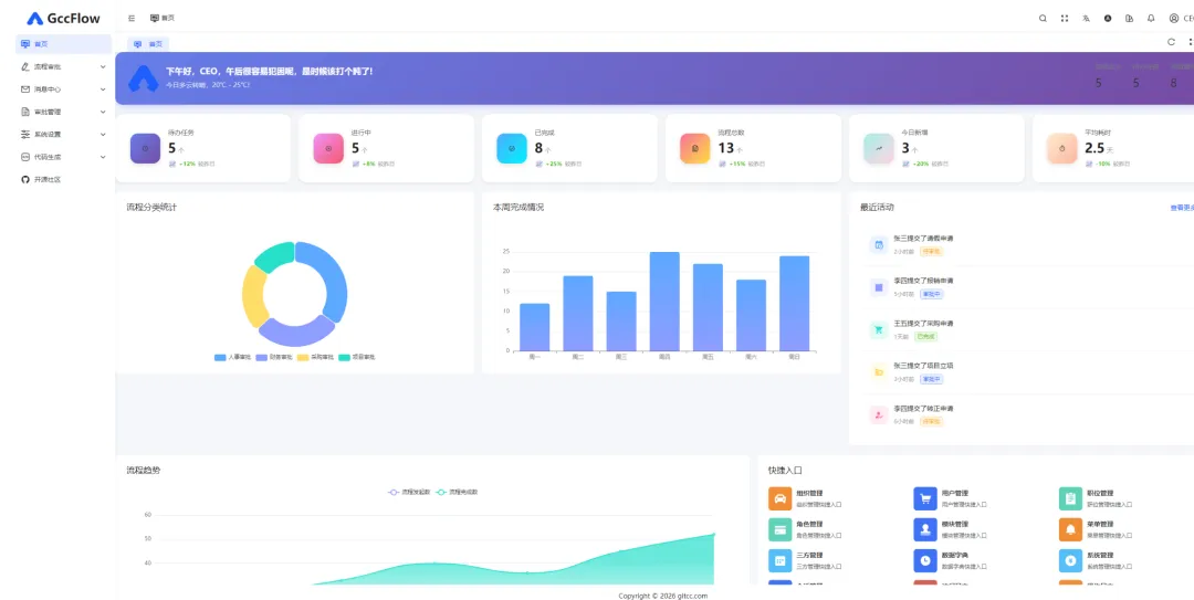 该系统基于 Spring Boot 3.5.0 + Vue 3 构建,集成 FiFlowActivi 工作流引擎,提供从流程设计到数据分析的全生命周期管理,助力企业实现审批流程的数字化、自动化与智能化。