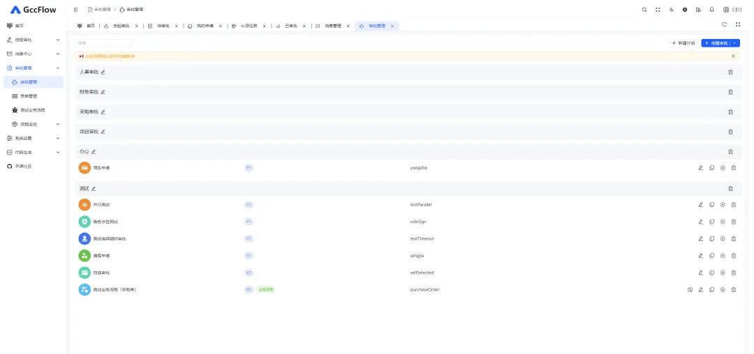 - 拖拽式流程建模:通过画布工具快速定义审批节点、分支条件、并行网关。