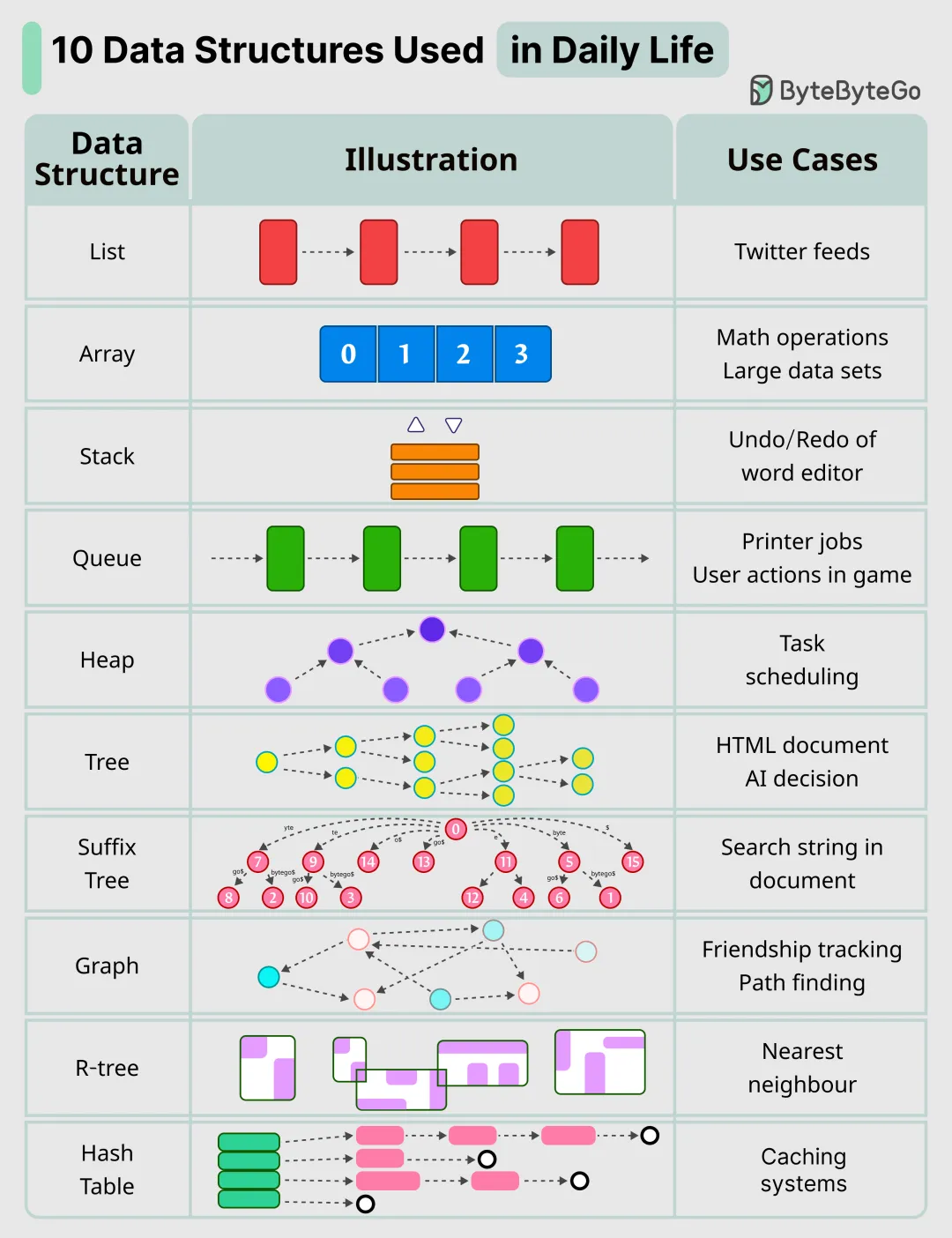 这10个数据结构覆盖了大部分开发场景:List有序数据,Stack撤销操作,Queue任务调度,Hash Table快速查找,Array数值计算,Heap优先队列,Tree分层数据,Suffix Tree字符串搜索,Graph关系网络,R-Tree空间查询,Vertex Buffer GPU渲染。