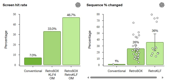 Retro 团队搭建人成纤维细胞湿实验筛选平台,借助 GPT-4b micro 生成多样化的 “RetroSOX”(SOX2 变体)和 “RetroKLF”(KLF4 变体)序列: