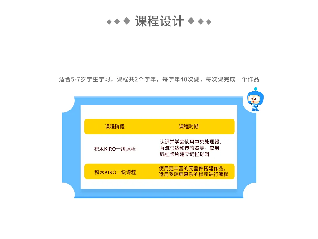 1.对应青少年人工智能技术水平测试启蒙级、一级、二级2.支持参与全国青少年人工智能创新挑战赛、世界机器人大会青少年机器人设计与信息素养大赛等权威赛事3.乐博乐博专属赛事平台,定期举办全国性积木 KIRO 创意大赛