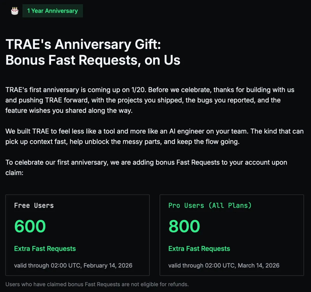 首先去官网 https://www.trae.ai下载TRAE国际版(不是国内版),然后在官网登录自己的账号,点击右上角“Claim Anniversary Gift”,然后拉到最下点击“claim”就可以了。