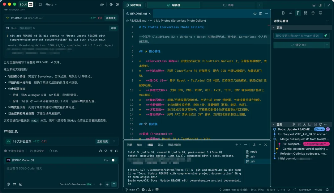 进入SOLO模式后,左侧就是和AI智能体对话的界面,直接告诉AI你想要实现什么功能,或者直接问他问题也行。中间就是编辑器和终端,主要写代码的地方。比如这里我就是直接让AI写了个README文档,然后我看这个文档,才知道项目里具体是咋回事。是的,我自己的项目,我还要看说明文档。在绑定Github账号后,可以让AI把改好的代码自动提交。