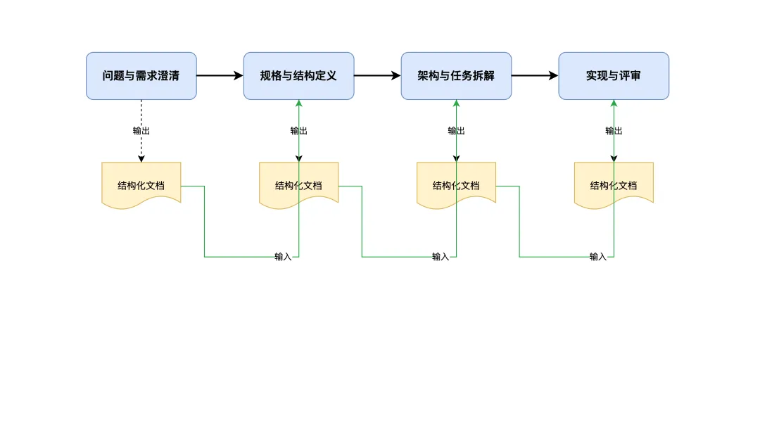 阶段之间需要有结构化产出,而不是直接跳到代码生成。这种设计的目的,是降低单次上下文的复杂度,而不是增加形式上的步骤。