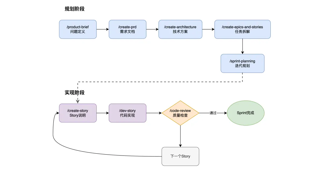 BMAD 强调将 AI 的参与过程拆分为多个阶段,例如: