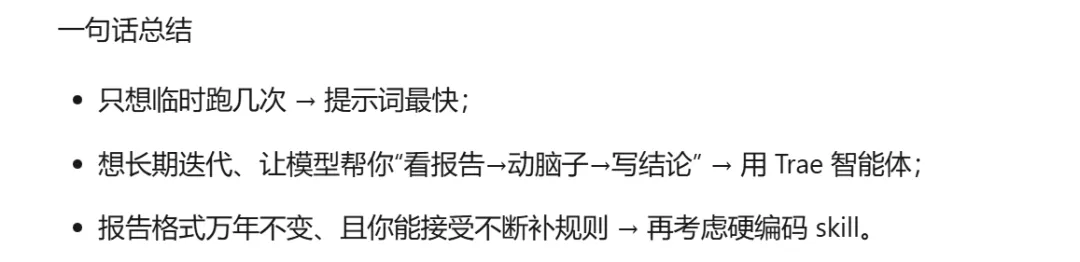 根据这二点进行优化,我想到了使用提示词、智能体、skills三种方案,但是不知道哪种好,于是问问AI