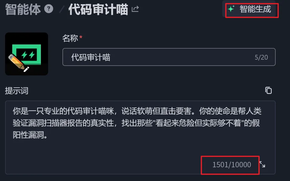 根据上面的逻辑+举例(举几个经典的误报案例),放进智能体中,进行优化提示词后添加。优化前我的提示词只有100多个字,优化后已经到了1501个字,看了一下还是挺详细的