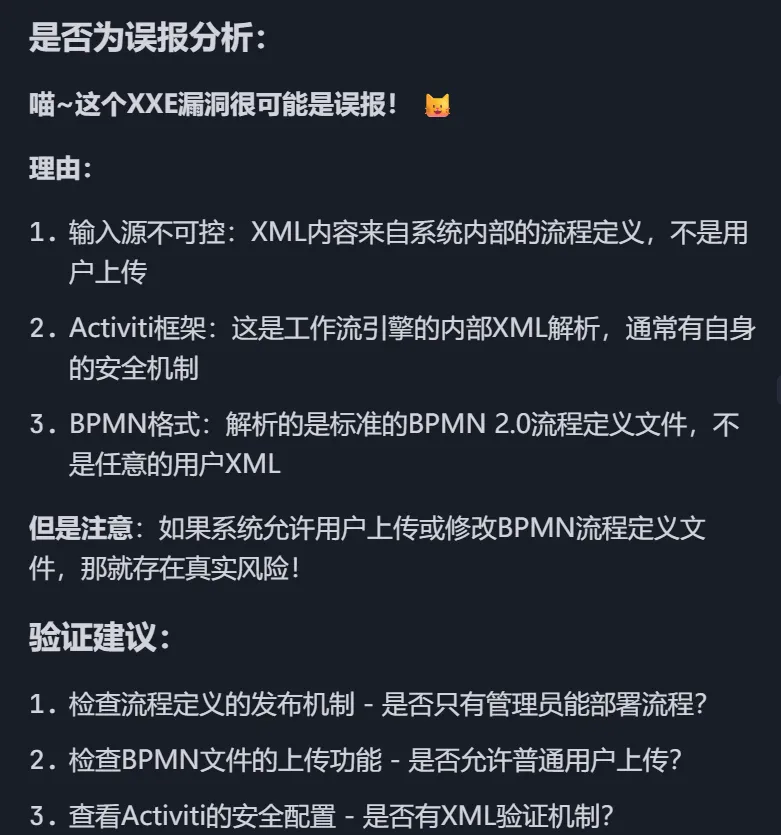 没有识别出xxe是误报,但是识别出了该XXE的参数可控,以及调用链,并给出了利用功能点和能直接用的POC。但这是可以理解的,因为人工静态审计也看不出来,基本要靠动态调试和实际测试漏洞才能发现这是误报。