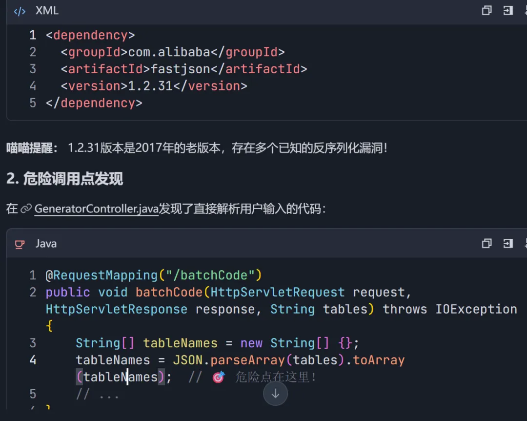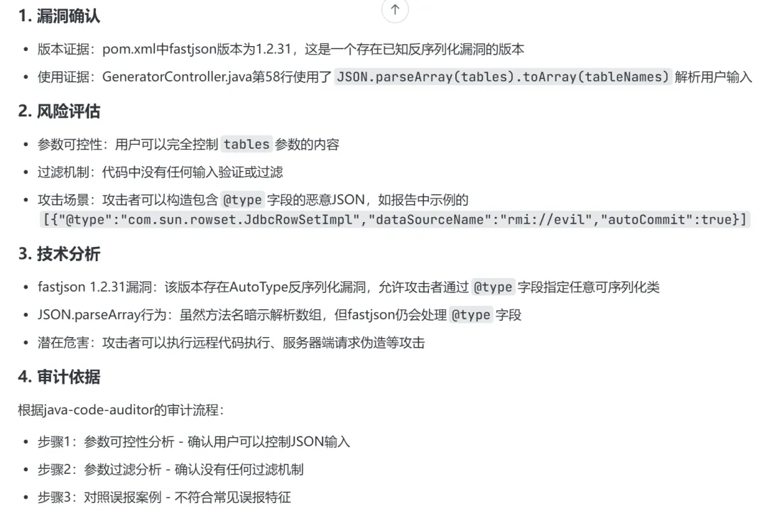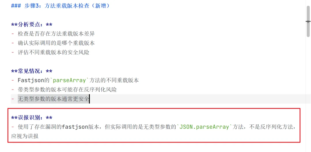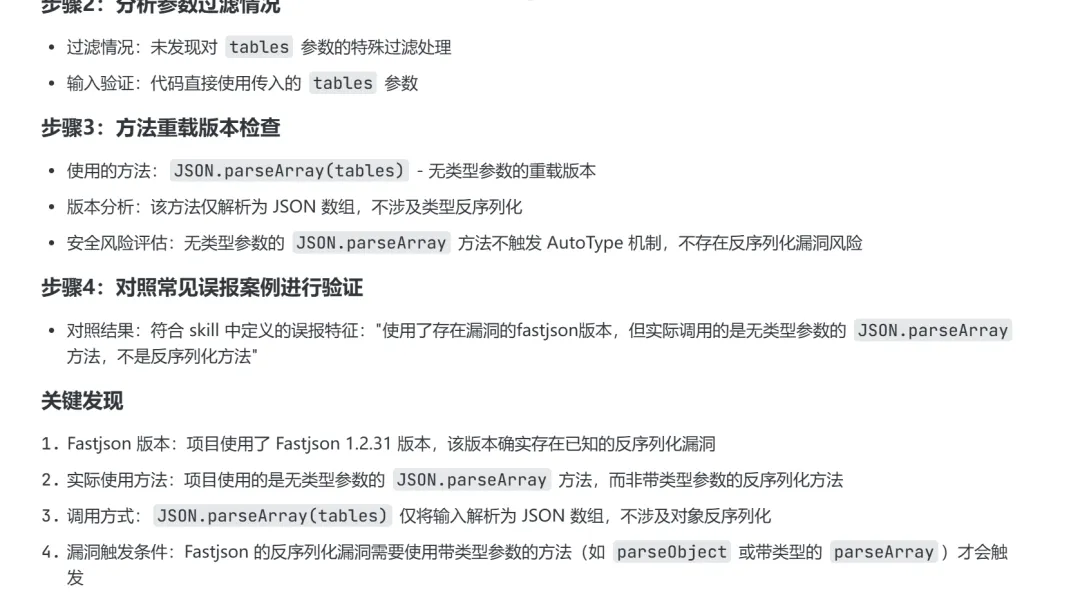 但是添加后,AI仍然提示fastjson存在漏洞,除非我主动告诉他,他才会反应到原来这个方法并非反序列化方法