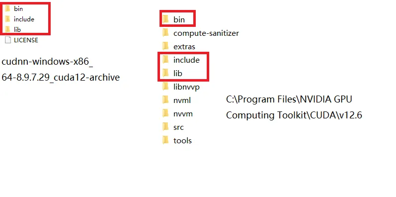 因为要使用cdDNN,所以下载了上面的相应版本。虽然网上说9以上的版本也可以支持,但为了保险起见,还是下载了较老的版本。这里有一个不同,9以上的直接打开exe安装即可。9以下,是解压版本,即下载的是一个压缩包,解压缩后,将cuDNN相应路径名下的文件拷贝到CUDA安装的相关路径下同名文件夹下即可(即合并相同文件夹及其下面的文件)。也不用重新指定环境变量。即下图所示: