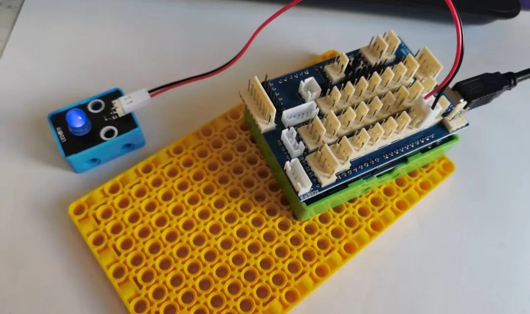 示范连接方法,强调“正负极不能接反”,否则LED无法点亮甚至损坏元件;提醒学生连接时轻插轻拔,避免损坏接口。