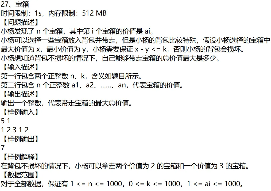 这是一道非常经典的双指针 + 前缀和的题目,叫做‘宝箱问题’。题目大意是:我们有 n 个宝箱,每个有价值 ai,我们要选一些宝箱,使得它们的最大值和最小值的差不超过 k,同时让总价值最大。”