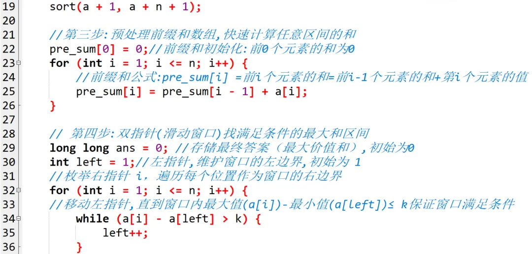 双指针遍历:for (int i=1; i<=n; i++) 枚举右指针,while (a[i]-a[left]>k) left++ 移动左指针,然后计算区间和更新答案。”