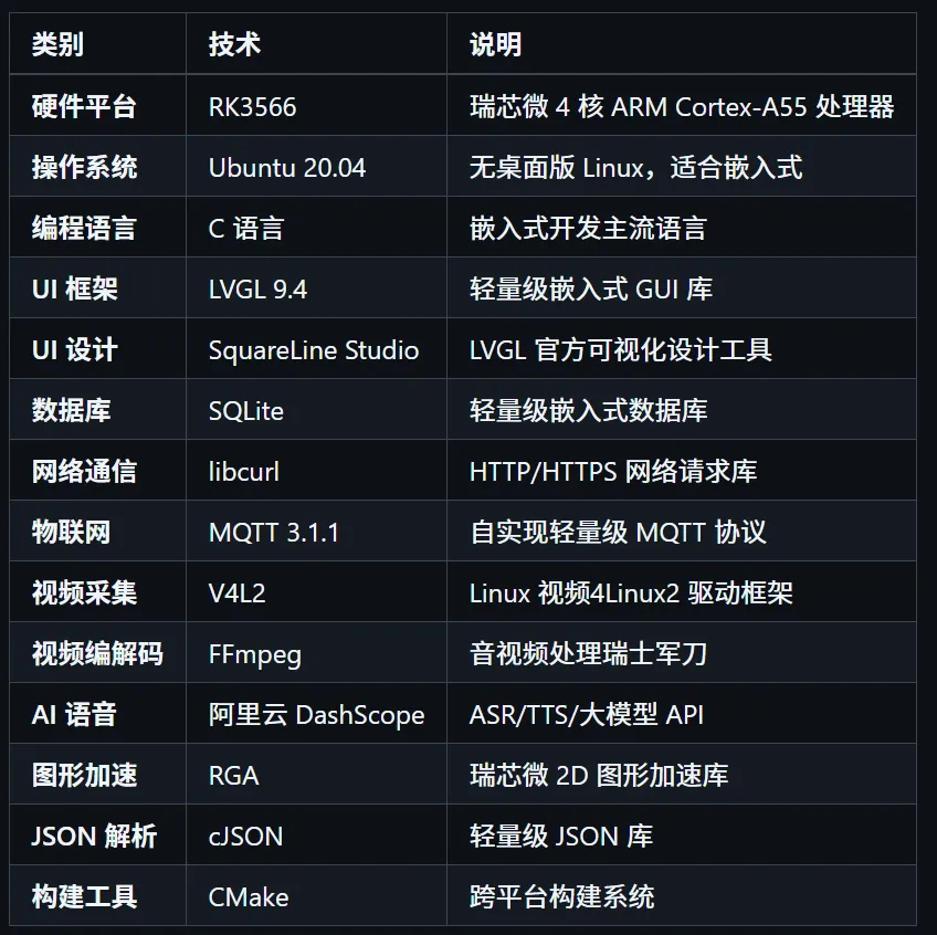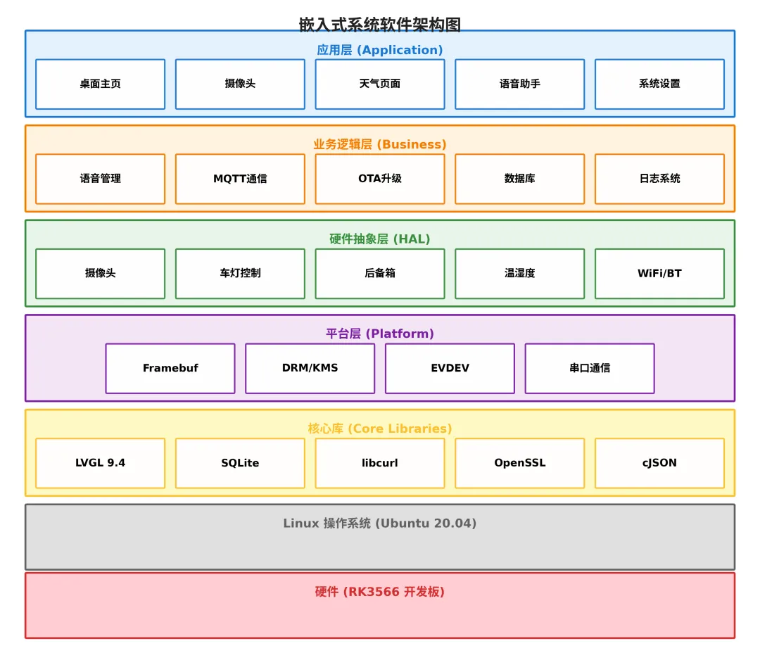 项目描述:开发了一套基于 rk3566 的车载中控屏系统,基于 Ubuntu20.04 + LVGL9.4 系统,支持 音乐播放器,视频播放器,相机拍照和录像,WiFi 联网,天气显示,雨刷控制,温湿度获取,AI 语音交互,OTA 远程升级,MQTT 远程控制和传感器数据上报等功能。
