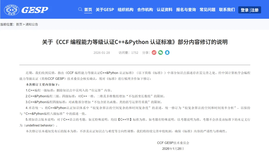 根据CCF GESP技术委员会2026年1月28日发布的官方通知,本次修订主要涉及以下五个方面: