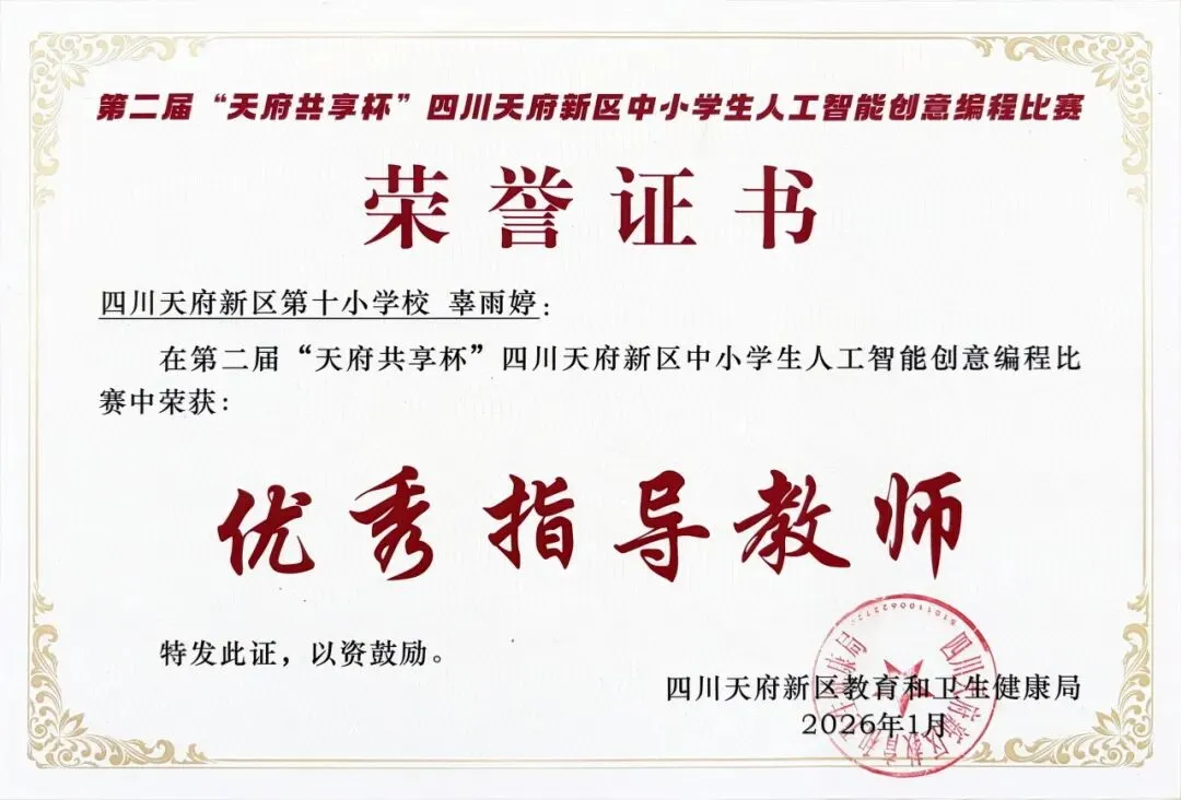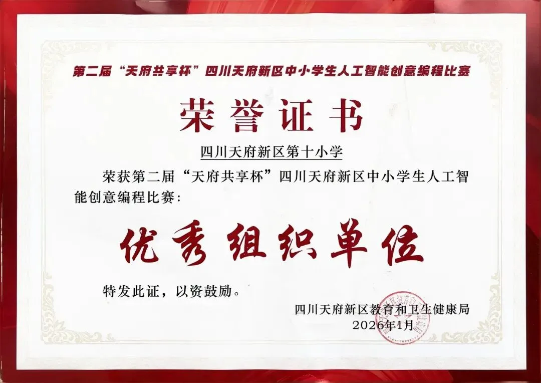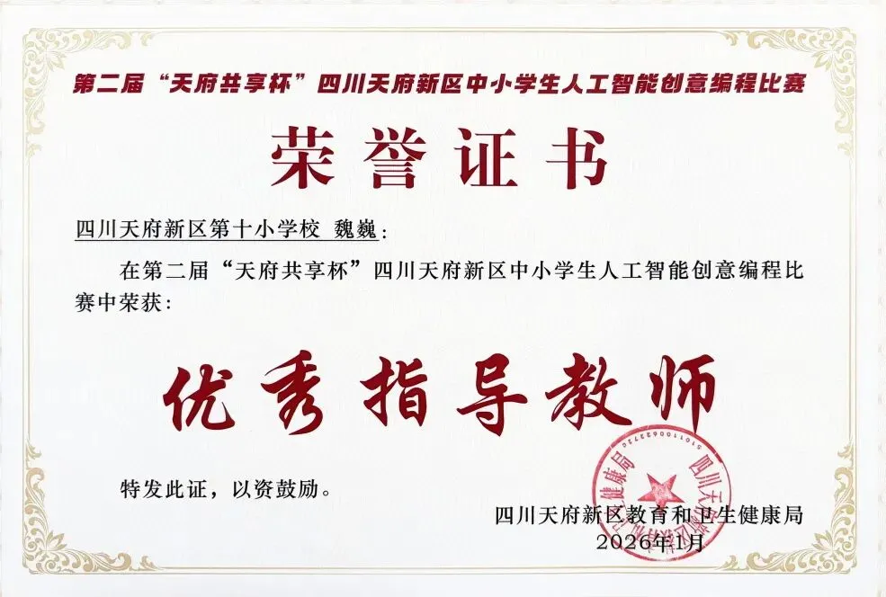第二届 “天府共享杯” 四川天府新区中小学人工智能创意编程比赛落下帷幕,我校收获多项荣誉:学校获评 “优秀组织单位”,信息组辜雨婷、魏巍老师荣获“优秀指导教师” 称号 ,10 名参赛学子凭借过硬实力斩获奖项,载誉而归!