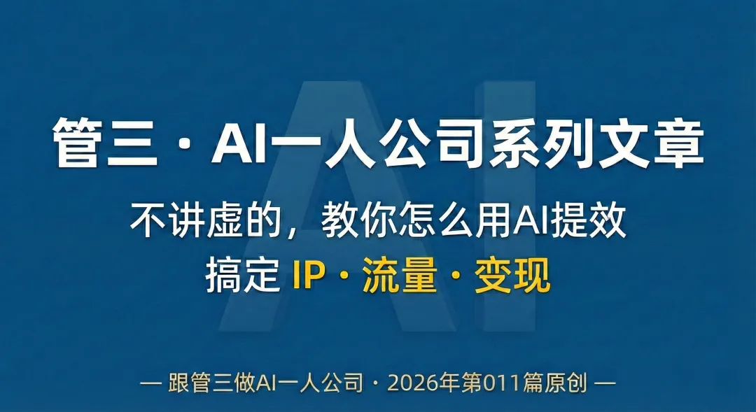 我是管三,一个用AI武装到牙齿的一人公司实践者,借助AI做短视频涨粉百万,写出多篇爆款文章,直播超过1000场,不讲虚的,教你怎么用AI提效,搞定IP、流量和变现。