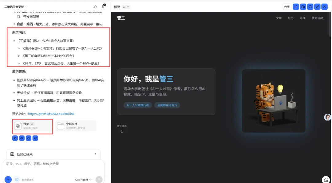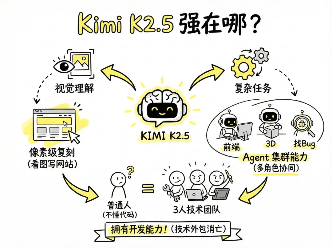总之,Kimi K2.5 让不懂代码的普通人,拥有了以前需要一支3人技术团队才能具备的开发能力。