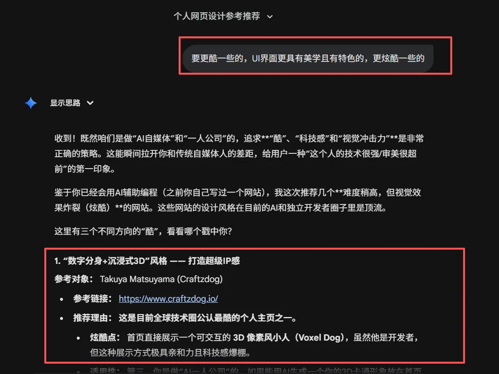 这次Gemini就直接推荐了全球顶级独立开发者 Craftzdog 的个人网站,我点进去看了,整体风格确实还不错。