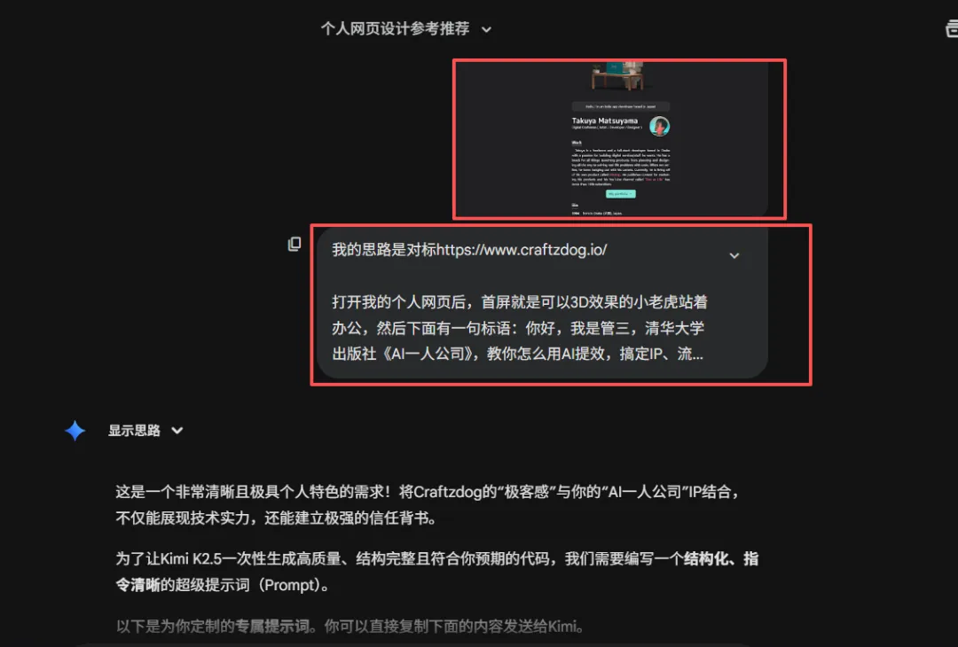 案例二:用Kimi K2.5做了一个超级炫酷的个人网页。