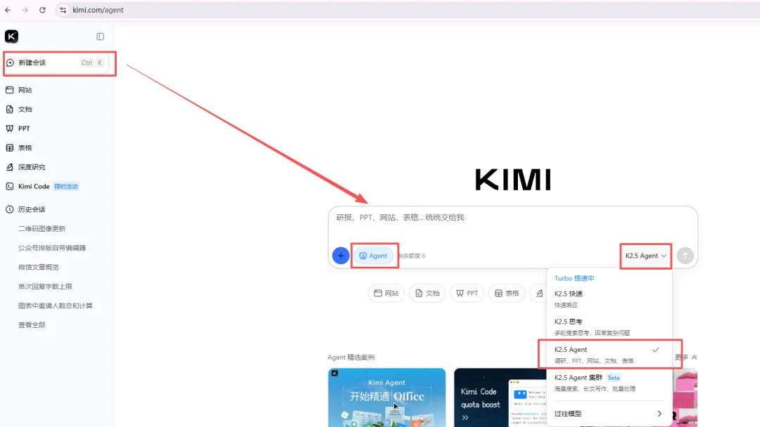 打开官网后,点击“新建会话”,勾选K2.5 Agent模型。