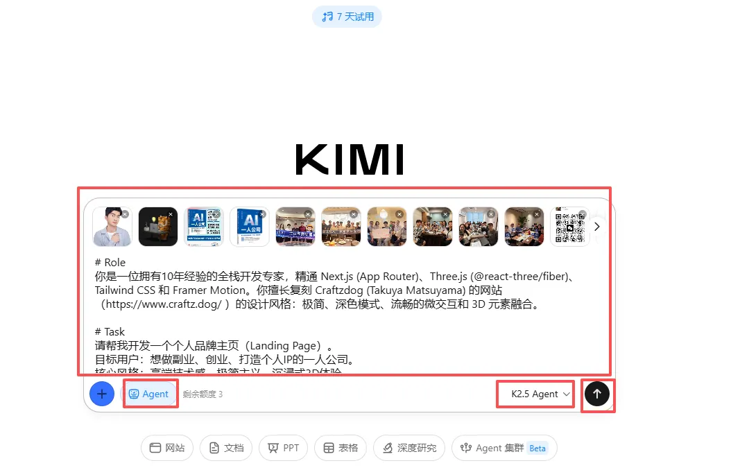 注意,这个K2.5Agent模型目前个人只有3次免费额度,尽量一次性把所有需求和素材都一次性上传到位。