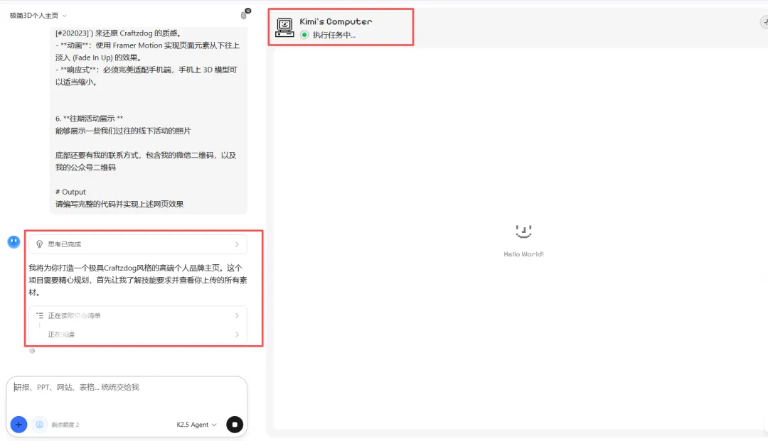 当你给它一个复杂任务,K2.5不再是一个人在战斗,它会在后台调用一个智能体集群:有的负责写前端,有的负责写3D,有的负责检查Bug。