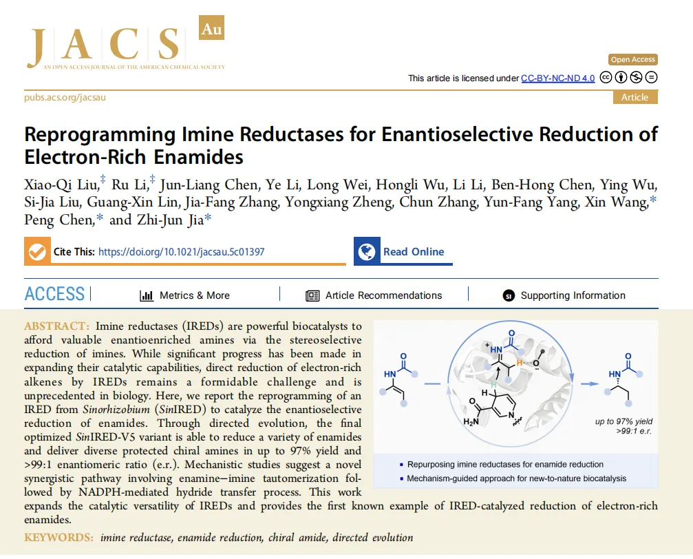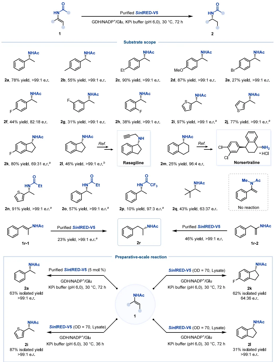 功能创新:首次实现了亚胺还原酶对富电子烯酰胺的直接对映选择性还原,突破了该类酶的天然催化功能限制。