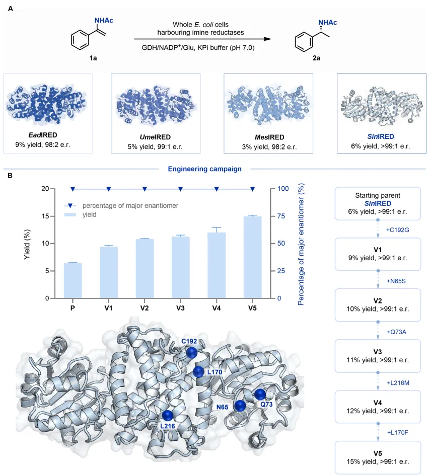2. 定向进化优化酶活性:利用AlphaFold2生成酶结构模型并进行分子对接,锁定活性中心附近的关键氨基酸位点。通过多轮定点饱和突变筛选,最终获得一个五重突变体 SinIRED-V5,其催化效率显著提升。