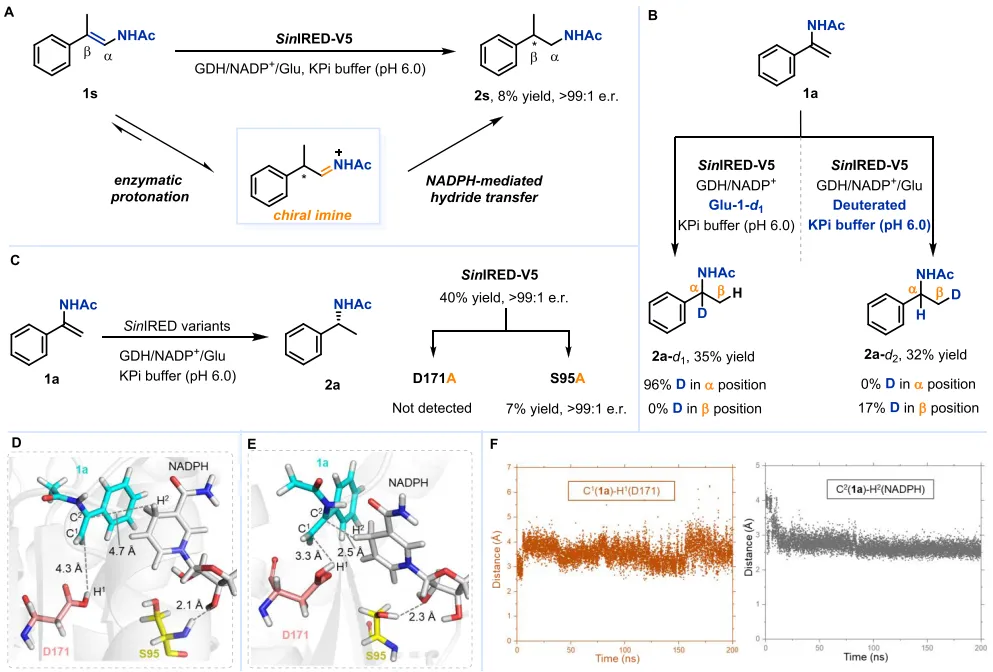 2. 新颖反应机理:机理研究证实,反应并非直接还原C=C键,而是遵循一个两步协同机制:首先,酶活性中心的氨基酸D171作为质子供体,质子化烯酰胺的β-碳,使其发生烯胺-亚胺互变异构,生成亚胺中间体;随后,NADPH提供的氢负离子对亚胺的α-碳进行立体选择性加成,最终得到还原产物。该机理完美解释了氘代实验中氘原子在α位和β位的标记位置。