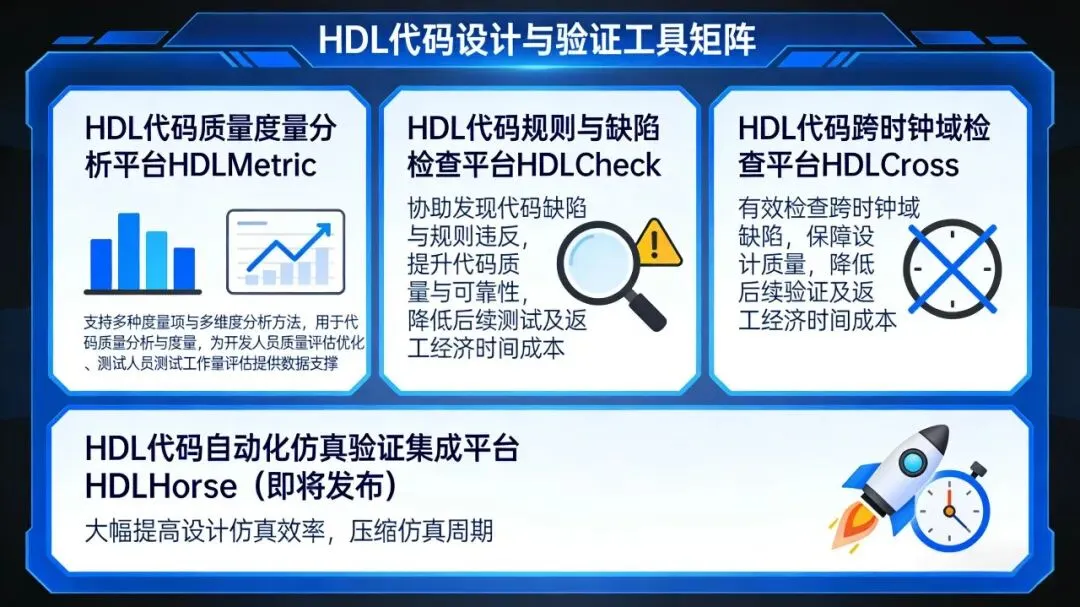 目前已发布多款面向HDL代码的设计和验证工具:HDL代码质量度量分析平台HDLMetric可支持多种度量项和多维度的分析方法,可用于HDL代码的质量分析与度量,为开发人员对HDL代码进行质量评估和优化,为测试人员进行测试工作量评估提供数据支撑;HDL代码规则与缺陷检查平台HDLCheck能够协助用户发现代码的缺陷和违反的规则,提高代码的质量与可靠性,可以有效降低后续测试及返工带来的经济和时间成本;HDL代码跨时钟域检查平HDLCross能够有效检查出设计中存在的跨时钟域缺陷,保障用户的设计质量,有效降低后续验证及返工带来的经济和时间成本。值得一提的是,深远华创即将发布HDL代码自动化仿真验证集成平台HDLHorse,将大幅提高HDL代码设计仿真的效率,有效压缩设计仿真的周期,敬请期待