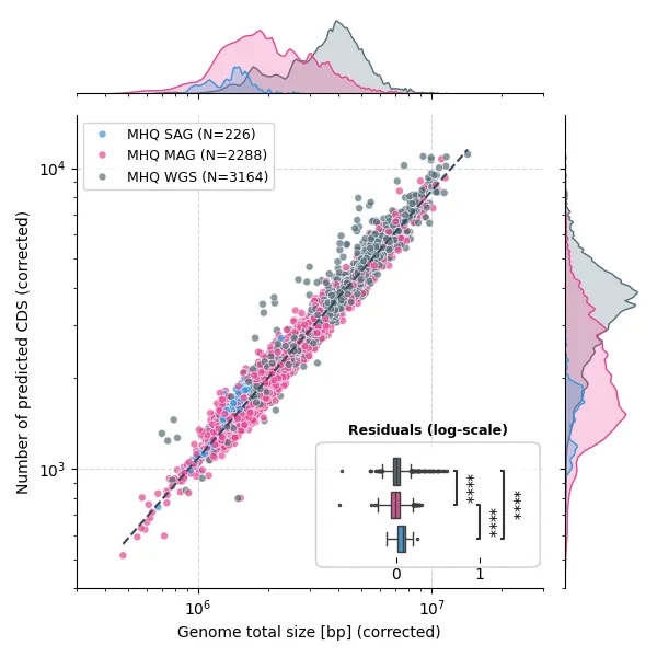"xlabel": "Genome total size [bp] (corrected)",