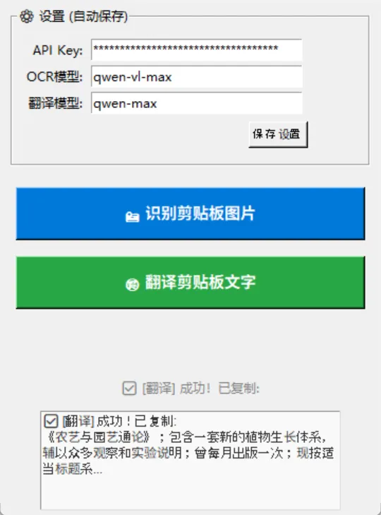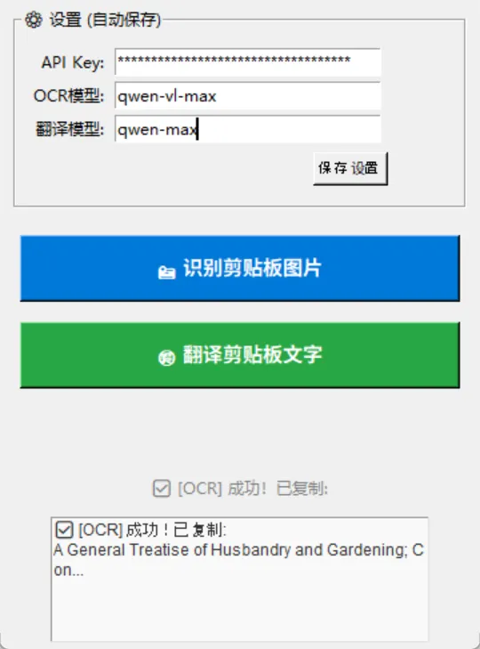 因此,我尝试用 AI 编程完成了一个轻量应用,内容很简单,包含两个功能:其一,使用截图工具截图到剪贴板后,自动进行图像识别,转化为文本并直接复制到剪贴板;其二,将剪贴板的文字翻译为中文,并且自动复制到剪贴板。只需填好自己的api密钥和所使用的模型名称即可使用,我这里用的是 qwen 的模型,目前试下来基本可以满足我的要求:
