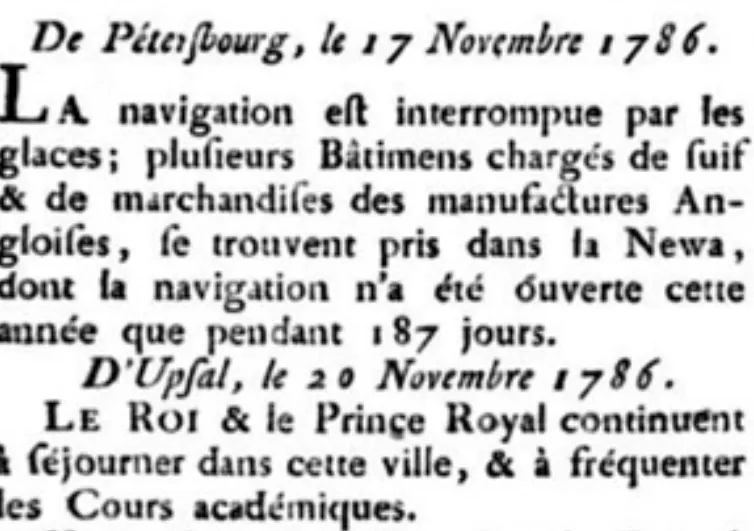 De Pétersbourg, le 17 Novembre 1786.LA navigation est interrompue par les glaces; plusieurs Bâtiments chargés de fuit & de marchandises des manufactures Angloises, se trouvent pris dans la Newa, dont la navigation n'a été ouverte cette année que pendant 187 jours.