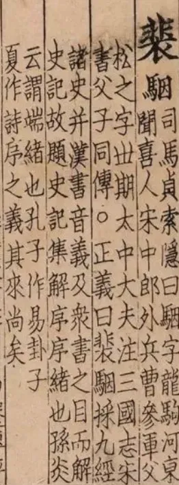裴駰司馬貞索隱曰駰字龍馹河東聞喜人宋中郎外兵曹參軍父松之字尗期太中大夫注三國志宋書父子同傳○正義曰裴駰採九經諸史幷漢書音義及衆書之目而解史記故題史記集解序序緒也孫炎云謂端緒也孔子作易卦子夏作詩序之義其來尚矣