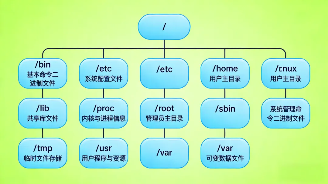 /(根目录)├─ bin(系统必备命令,任何人可执行)├─ sbin(系统管理员必备命令,普通用户不可执行)├─ etc(系统所有配置文件存放目录)├─ home(普通用户的家目录,每个用户一个子目录)├─ root(超级管理员 root 的家目录,普通用户无权访问)├─ var(动态文件目录,日志、缓存、临时文件等)├─ usr(用户程序目录,系统自带软件、第三方软件都在这里)├─ tmp(临时文件目录,所有用户可读写,重启后内容清空)├─ boot(系统启动目录,存放内核、启动配置文件)├─ dev(设备文件目录,所有硬件设备都以文件形式存在这里)├─ proc(虚拟文件目录,存放系统运行时的实时信息,不占用磁盘空间)├─ sys(虚拟文件目录,存放硬件设备的驱动信息,不占用磁盘空间)├─ mnt(临时挂载目录,用于挂载U盘、移动硬盘等外接设备)└─ media(自动挂载目录,系统会自动识别外接设备并挂载到这里)
