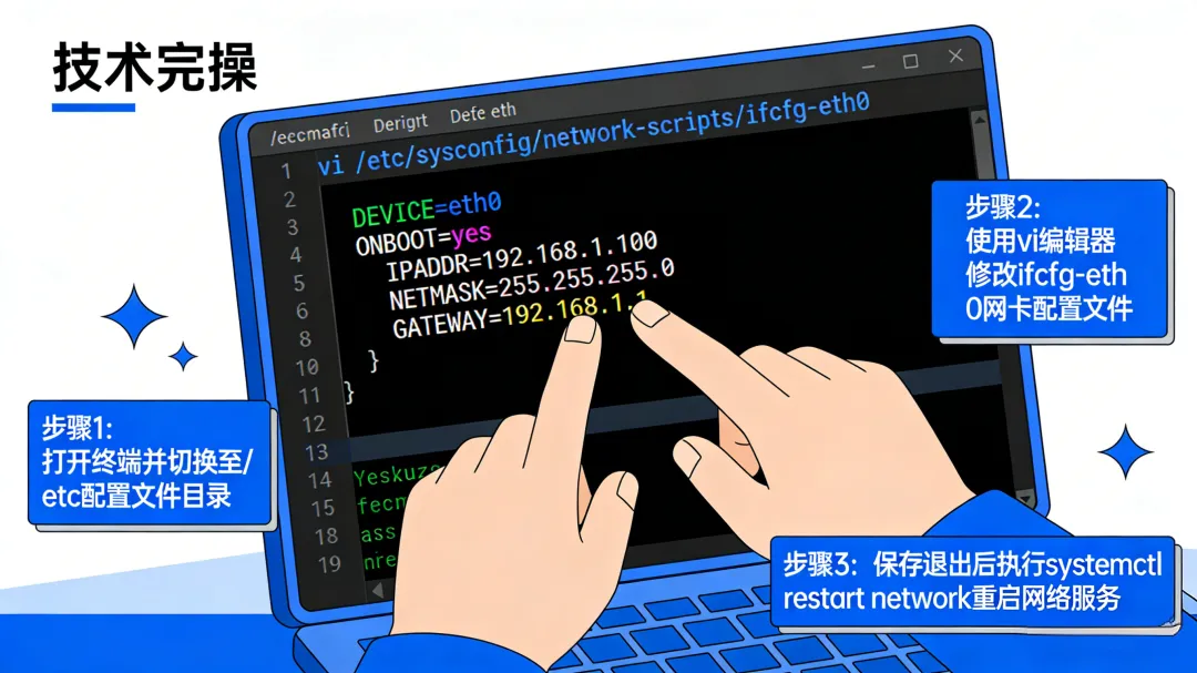 案例1:修改网卡IP地址:1. 备份网卡配置文件:[root@localhost ~]# cp /etc/sysconfig/network-scripts/ifcfg-eth0 /etc/sysconfig/network-scripts/ifcfg-eth0.bak2. 编辑网卡配置文件:[root@localhost ~]# vi /etc/sysconfig/network-scripts/ifcfg-eth03. 修改IP地址相关配置(比如将IP改为192.168.1.100):IPADDR=192.168.1.100NETMASK=255.255.255.0GATEWAY=192.168.1.1DNS1=8.8.8.84. 保存退出,重启网络服务:[root@localhost ~]# systemctl restart network5. 验证IP是否修改成功:[root@localhost ~]# ip addr show eth0