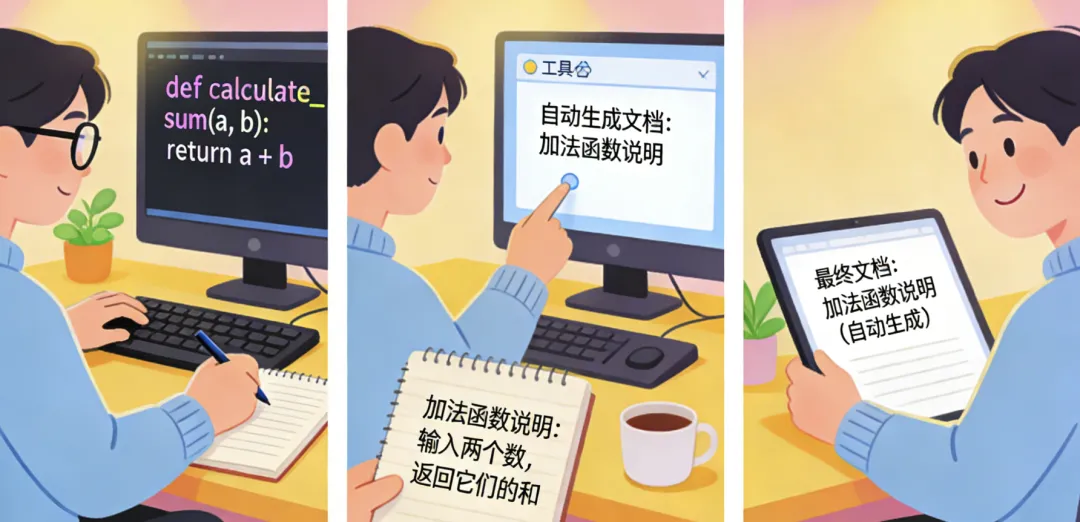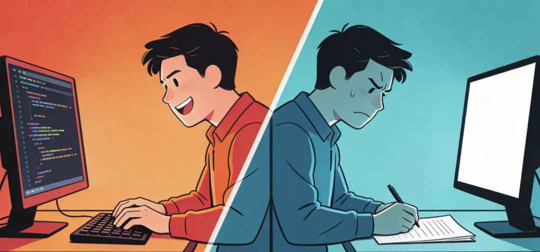 配图提示词:对比图,左边程序员写代码笑容满面,右边写文档痛苦面具,冷暖色调对比