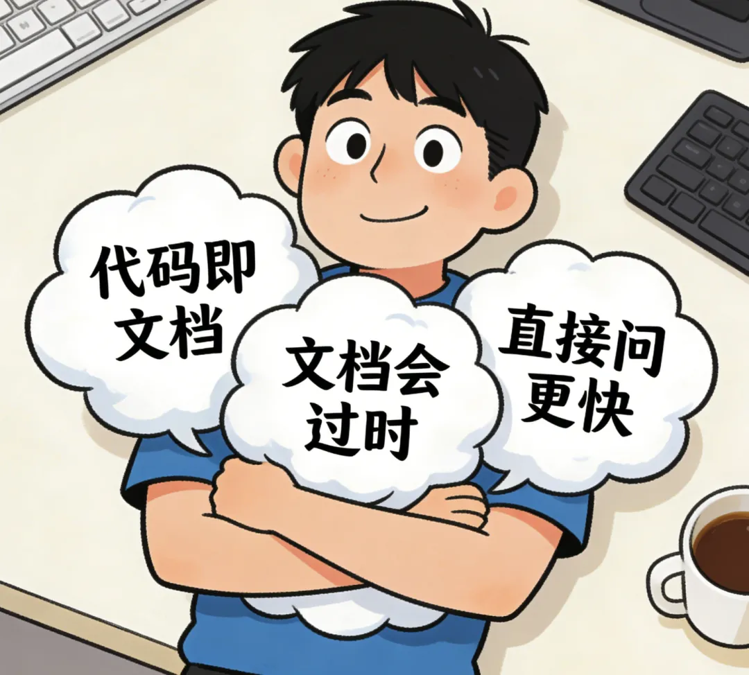 说这话的时候理直气壮:"我的代码写得这么清晰,变量命名这么规范,看代码不就完了?"