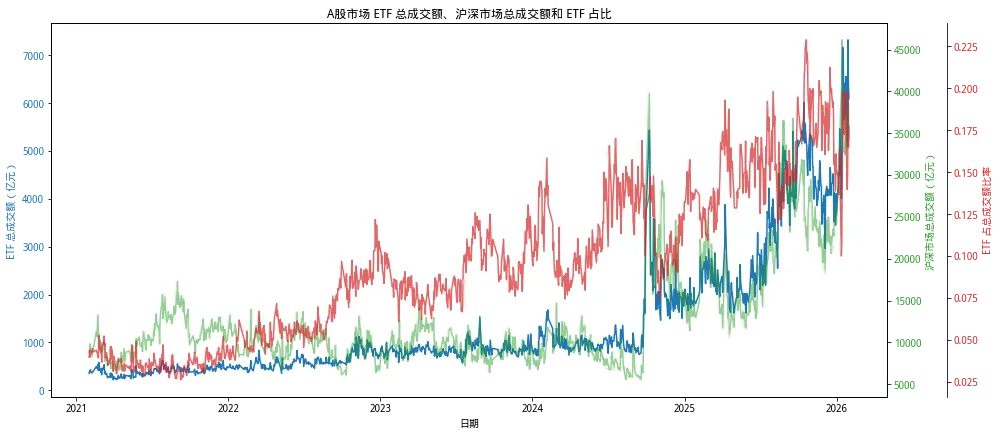 比特币终于跌了,好好好,再跌一些。它在8-9万刀这个区间徘徊了几个月了。同样作为主权货币信用危机的替代品,比特币跟黄金相比,这一波简直是根本没涨。但是呢,黄金回调,它就顺势破位了。好好好。比特币当前的市值,或者说虚拟币的总市值,只有黄金的二十到三十分之一吧,所以还是小众品种。小众有小众的好处,就是还不卷,有巨大的投资价值。这周末最大的新闻就是黄金、白银剧烈调整了。又要横盘一段时间了。这周末跟老妈聊天,了解到广大民众已经在出售自己的金首饰了,最近暴雷的那个什么黄金平台(名字太难记了)就是收黄金的。在《西蒙斯传》里面,也有这么一个桥段,是上世纪七八十年代吧,黄金和白银疯狂上涨,他的合伙人买入黄金的头寸达到千万级别美元了,还坚定持有,而西蒙斯从别人那里得知普罗大众正在排队出售之前买的金银首饰,西蒙斯判断市场供给会大幅提升,黄金价格将出现下降,他立马清仓了黄金,但是他的合伙人还是坚定持有,因为价格并没有任何的下跌现象。..............................................................现在每天市场的成交额都在3万亿左右,这里面是包含所有场内etf的。我自己搞了代码,统计了近5年的全市场ETF的成交额,以及占比,如图。可以看到,成交额是螺旋上升的,最近已经来到了6000-7000亿每天的成交额区间了,占比已经从不足5%来到了17.5-22.5%这个区间了。