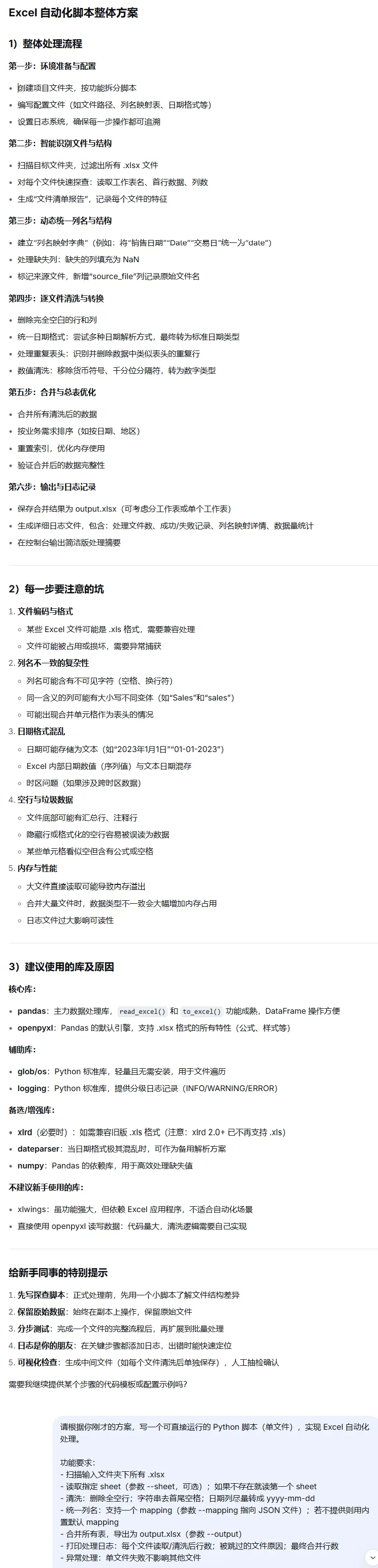 我要写一个 Excel 自动化脚本,请你先不要写代码。需求:- 批量读取文件夹里的 xlsx- 清洗数据(空行、空列、字符串去空格、日期统一)- 统一列名(支持 mapping)- 合并成一个总表并导出- 有处理日志,单个文件失败不影响其他文件请你只输出:1)整体处理流程(3-6 步)2)建议的模块拆分3)常见坑(给新手看的)