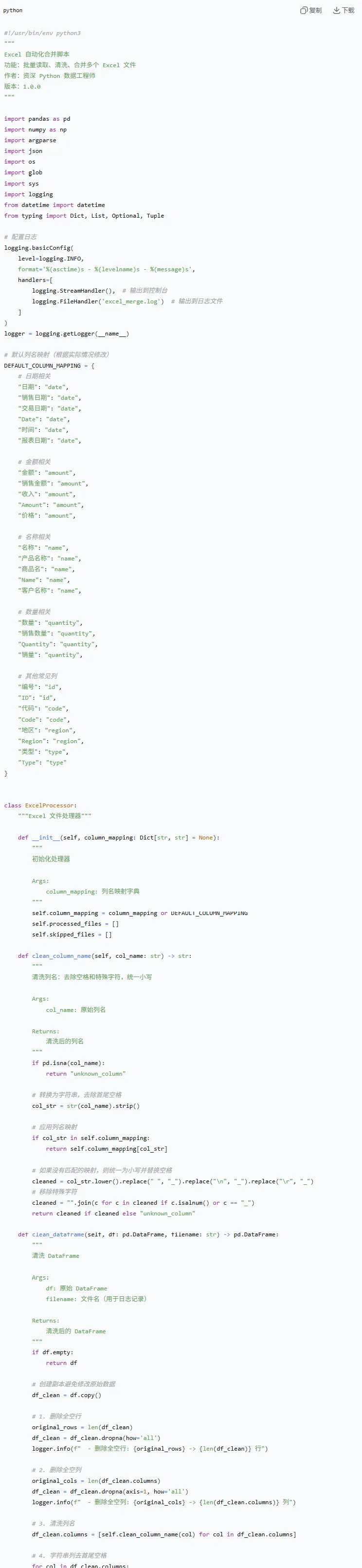 请根据你刚才的方案,写一个可直接运行的 Python 脚本(单文件),实现 Excel 自动化处理。功能要求:- 扫描输入文件夹下所有 .xlsx- 读取指定 sheet(参数 --sheet,可选);如果不存在就读第一个 sheet- 清洗:删除全空行;字符串去首尾空格;日期列尽量转成 yyyy-mm-dd- 统一列名:支持一个 mapping(参数 --mapping 指向 JSON 文件);若不提供则用内置默认 mapping- 合并所有表,导出为 output.xlsx(参数 --output)- 打印处理日志:每个文件读取/清洗后行数;被跳过的文件原因;最终合并行数- 异常处理:单文件失败不影响其他文件工程要求:- Python 3.10+- 使用 pandas + openpyxl- 必须有 main(),用 argparse 解析参数- 给我 3 个运行示例命令- 最后再给“常见报错排查清单”(比如缺依赖、sheet 不存在、编码问题等)