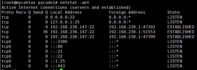 以数字方式列出所有TCP连接情况: netstat -ant