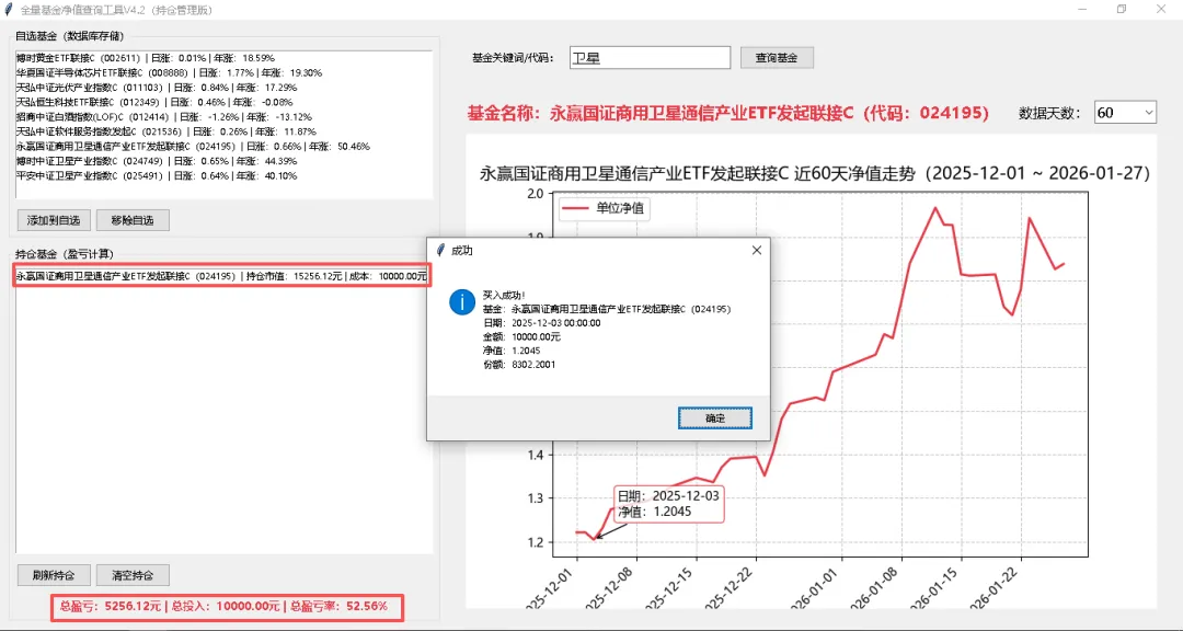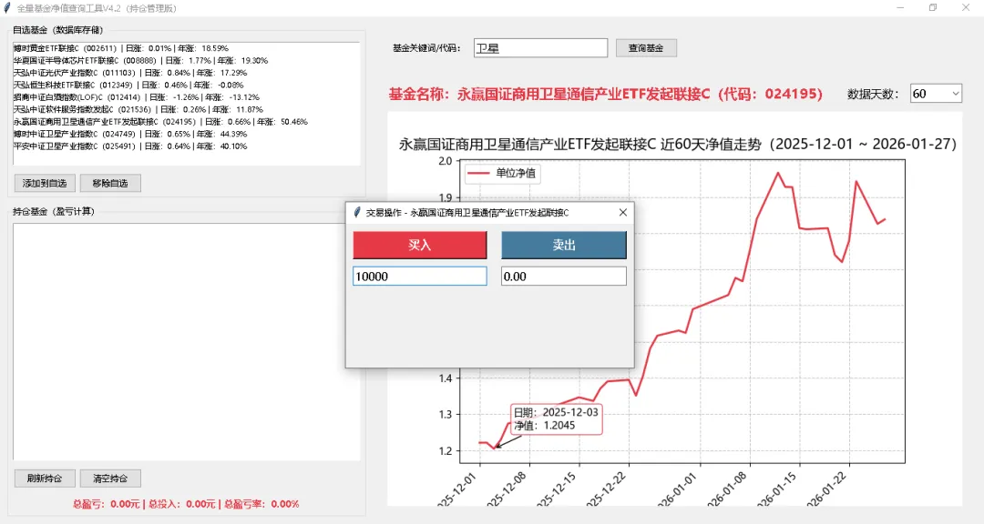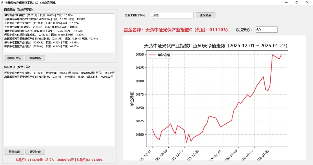 # ========== 界面布局(新增持仓区域) ========== main_frame = ttk.Frame(self.root) main_frame.pack(fill=tk.BOTH, expand=True, padx=10, pady=10) # 左侧区域:自选+持仓 left_total_frame = ttk.Frame(main_frame) left_total_frame.pack(side=tk.LEFT, fill=tk.Y, padx=(0, 10)) # 自选基金区域 fav_frame = ttk.LabelFrame(left_total_frame, text="自选基金(数据库存储)") fav_frame.pack(fill=tk.X, padx=0, pady=(0, 10)) self.fav_listbox = tk.Listbox(fav_frame, font=("微软雅黑", 8), width=80, height=10) self.fav_listbox.pack(padx=5, pady=5) self.fav_listbox.bind("<Double-Button-1>", self.fav_double_click) # 自选操作按钮 fav_btn_frame = ttk.Frame(fav_frame) fav_btn_frame.pack(padx=5, pady=5, fill=tk.X) ttk.Button(fav_btn_frame, text="添加到自选", command=self.add_to_fav).pack(side=tk.LEFT, padx=2) ttk.Button(fav_btn_frame, text="移除自选", command=self.remove_fav).pack(side=tk.LEFT, padx=2) self.refresh_fav_list() # 新增:持仓基金区域 position_frame = ttk.LabelFrame(left_total_frame, text="持仓基金(盈亏计算)") position_frame.pack(fill=tk.BOTH, expand=True) # 持仓列表 self.position_listbox = tk.Listbox(position_frame, font=("微软雅黑", 8), width=80, height=8) self.position_listbox.pack(padx=5, pady=5, fill=tk.BOTH, expand=True) # ========== 新增:绑定右键菜单 ========== # 创建右键菜单 self.position_menu = tk.Menu(self.root, tearoff=0) self.position_menu.add_command(label="删除该持仓", command=self.delete_selected_position) # 绑定右键点击事件 def show_position_menu(event): # 获取点击位置的列表项 try: # 定位选中的列表项 self.position_listbox.selection_clear(0, tk.END) self.position_listbox.selection_set(self.position_listbox.nearest(event.y)) # 显示右键菜单 self.position_menu.post(event.x_root, event.y_root) except: pass self.position_listbox.bind("<Button-3>", show_position_menu) # 绑定右键点击 # 持仓操作按钮 position_btn_frame = ttk.Frame(position_frame) position_btn_frame.pack(padx=5, pady=5, fill=tk.X) ttk.Button(position_btn_frame, text="刷新持仓", command=self.refresh_position_list).pack(side=tk.LEFT, padx=2) ttk.Button(position_btn_frame, text="清空持仓", command=self.clear_all_position).pack(side=tk.LEFT, padx=2) # 持仓汇总信息 self.position_summary_label = ttk.Label(position_frame, text="总盈亏:0.00元 | 总盈亏率:0.00%", font=("微软雅黑", 10, "bold"), foreground="#e63946") self.position_summary_label.pack(padx=5, pady=5)