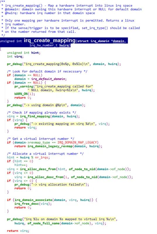 中断域是连接 hwirq 和 virq 的桥梁,所有转换操作都依赖中断域完成。向系统注册一个irq domain,具体HW interrupt ID和IRQ number的映射关系都是空的,因此,具体各个irq domain如何管理映射所需要的database还是需要建立的。例如:对于线性映射的irq domain,我们需要建立线性映射的lookup table,对于Radix Tree map,我们要把那个反映IRQ number和HW interrupt ID的Radix tree建立起来。创建映射有四个接口函数,代码位于kernel/kernel/irq/irqdomain.c。1. 调用irq_create_mapping函数