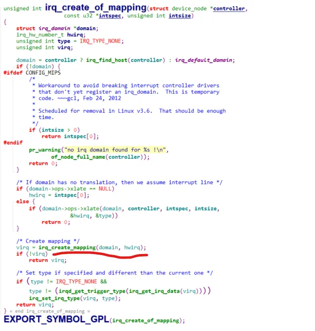 看到函数名字中的of(open firmware)。这是设备树场景下的封装方法,会自动从设备树中解析 hwirq 和 irq_domain,然后完成转换,无需手动提取这两个核心参数,更贴合现代嵌入式 Linux 驱动开发。irq_create_of_mapping() 是设备树场景下的专用中断映射函数,核心功能是:从设备树中断描述信息中提取出「中断域(irq_domain)」和「硬件中断号(hwirq)」,自动调用irq_create_mapping()建立映射,最终返回内核虚拟中断号(virq)。通常,一个普通设备的device tree node已经描述了足够的中断信息,在这种情况下,该设备的驱动在初始化的时候可以调用irq_of_parse_and_map这个接口函数进行该device node中和中断相关的内容(interrupts和interrupt-parent属性)进行分析,并建立映射关系。unsignedintirq_of_parse_and_map(struct device_node *dev, int index){struct of_irq oirq;if (of_irq_map_one(dev, index, &oirq))//分析device node中的interrupt相关属性return 0;return irq_create_of_mapping(oirq.controller, oirq.specifier, oirq.size);//创建映射,并返回对应的IRQ number}EXPORT_SYMBOL_GPL(irq_of_parse_and_map);