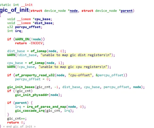 其中 irq = irq_of_parse_and_map(node, 0);--解析second GIC的interrupts属性,并进行mapping,返回IRQ numbergic_cascade_irq(gic_cnt, irq);---设置handlervoid __initgic_cascade_irq(unsigned int gic_nr, unsigned int irq){ if (irq_set_handler_data(irq, &gic_data[gic_nr]) != 0)---设置handler data BUG(); irq_set_chained_handler(irq, gic_handle_cascade_irq);---设置handler}