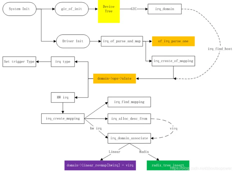 最开始的DTB文件,到初始化DeviceTree的时候关于中断拓扑数据结构,然后在of_irq_init中调用合适的驱动进行初始化,最后在驱动初始化中创建映射关系。驱动入口注册 → 设备树匹配 → 探针函数执行(核心)→ 硬件初始化 → 创建irq_domain → 注册中断操作集 → 完成加载。