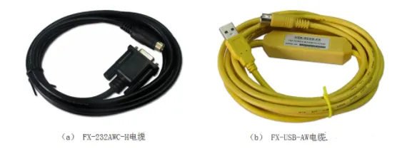 PLC与计算机连接需要用到通信电缆,常用电缆有两种:一种是FX-232AWC-H(简称SC09)电缆,如图所示,该电缆含有RS-232C/RS-422转换器;另一种是FX-USB-AW(又称USB-SC09-FX)电缆,如图所示,该电缆含有USB/RS-422转换器。