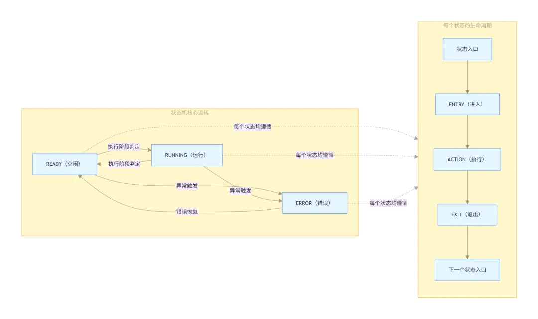 在实际嵌入式开发中,要设计出贴合项目需求的状态机,首要任务是理清三个核心问题:项目需要多少个核心状态、状态之间的切换流程是什么、每种状态的生命周期如何管理。而流程图,正是梳理这些问题、落地状态机设计的关键工具——它能将抽象的状态与流转逻辑可视化,避免后续代码开发陷入逻辑混乱。为了让大家快速理解,我们先绘制一个简化的嵌入式设备状态流程图(如上图所示),该流程图仅定义了三个最基础且通用的核心状态:空闲(Ready)、运行(Running)、错误(ERROR),同时明确了每种核心状态对应的“进入-执行-退出”子状态(即生命周期阶段)。讲到这里,很多新手可能会有一个误区:认为“空闲状态”就意味着设备不执行任何操作,因此只需处理“进入空闲”和“退出空闲”两个事件即可。实则不然——设备在空闲态并非完全“闲置”,只是其执行的操作不影响核心业务功能,更多是用于“监听触发条件”,为状态切换做准备。我们举一个贴近生活的工业设备类比:一个具备加热功能的工业恒温水杯,其核心业务是“加热至指定温度”。我们可以将其抽象为两个核心状态:空闲态(未执行加热动作)、运行态(加热中)。那么这个水杯在空闲态会做什么?答案是“持续检测触发条件”——比如监听水杯上的启动按键,判断是否有用户按下;同时可能检测当前水温,确认是否需要再次启动加热。这些“不影响核心加热功能,但保障状态正常切换”的操作,就是空闲态的“执行事件”。这里需要强调一个关键规则:状态的切换并非随机发生,仅当“执行阶段(Action)”判定满足切换条件时,才会触发当前状态的“退出阶段(Exit)”,进而进入下一个状态的“进入阶段(Entry)”,确保状态流转的有序性。二、状态机的核心结构体设计:用代码封装生命周期